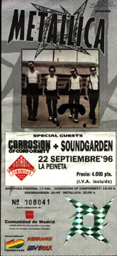 Otro Tour de Metallica, anterior al actual, fue el subsiguiente al lanzamiento de su hasta ahora último álbum, "Load", llamado "Poor Touring Me". Las fechas y lugares donde se escuchó el sonido de Metallica se detallan a continuación. Ni que decir tiene la especial mención al concierto de Madrid, uno de los tres que dieron en España, que fue al que asistí. Desde luego, es una experiencia memorable ver tocar a Metallica en vivo, aunque haga frío y esté lleno de gente, aunque comience más tarde de lo previsto y los perritos calientes cuesten 300 pelas y sean ridículos. |